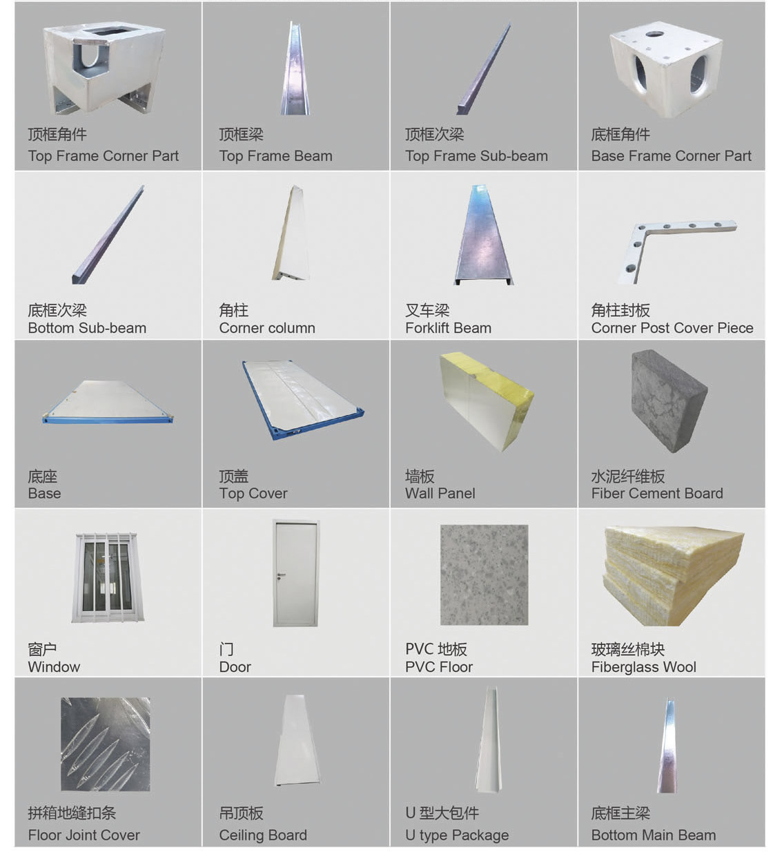 装配式集装箱房是一款基于钢框架和轻质墙板结构体系的模块化集装箱活动房。该产品由顶框、底框、角柱和14块可互换的墙板组成,可打包包装,便于陆地或海上运输。主体结构包括,顶框、底框、4根角柱、14块可互换墙板、门窗、电路系统等。